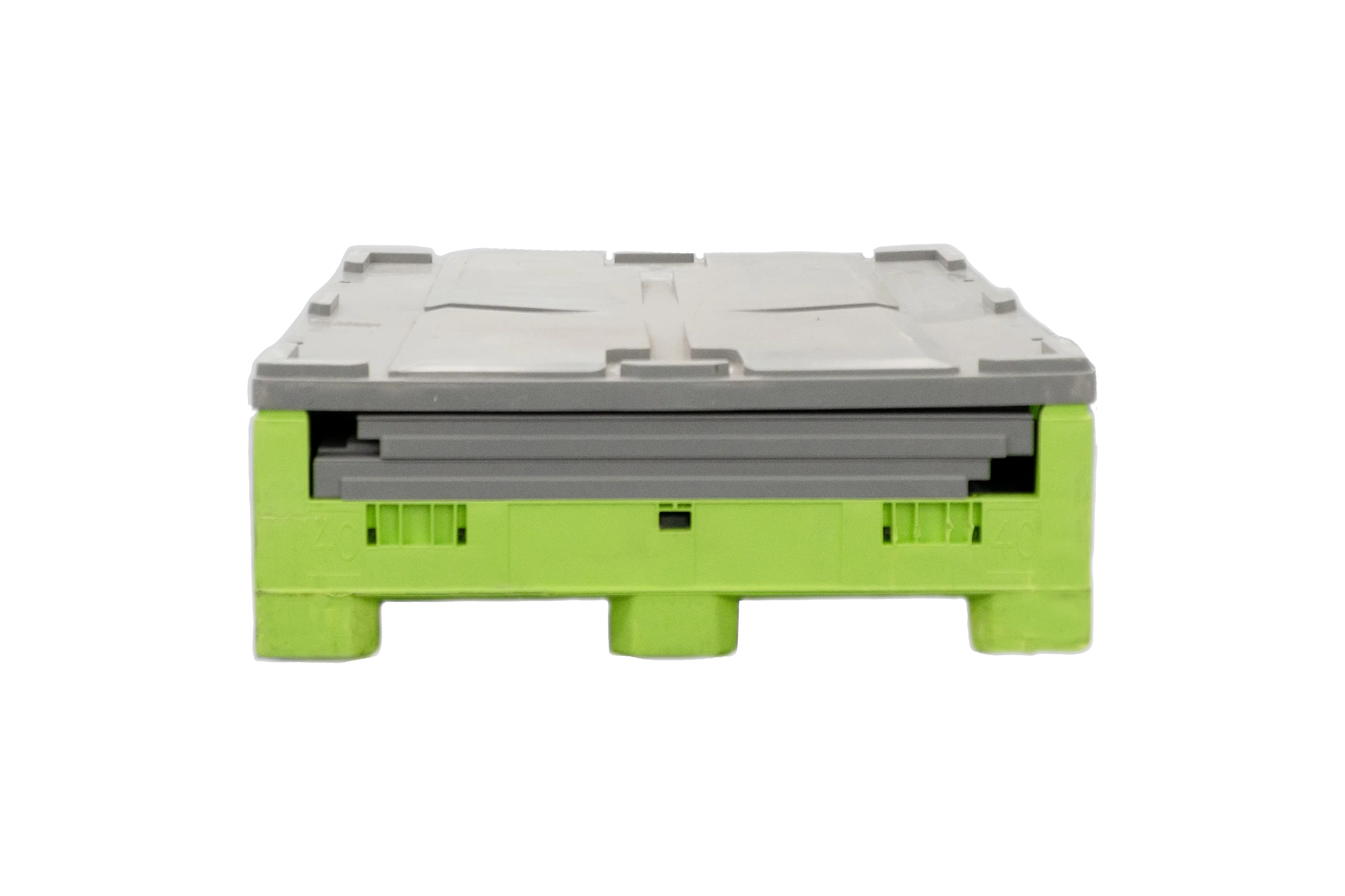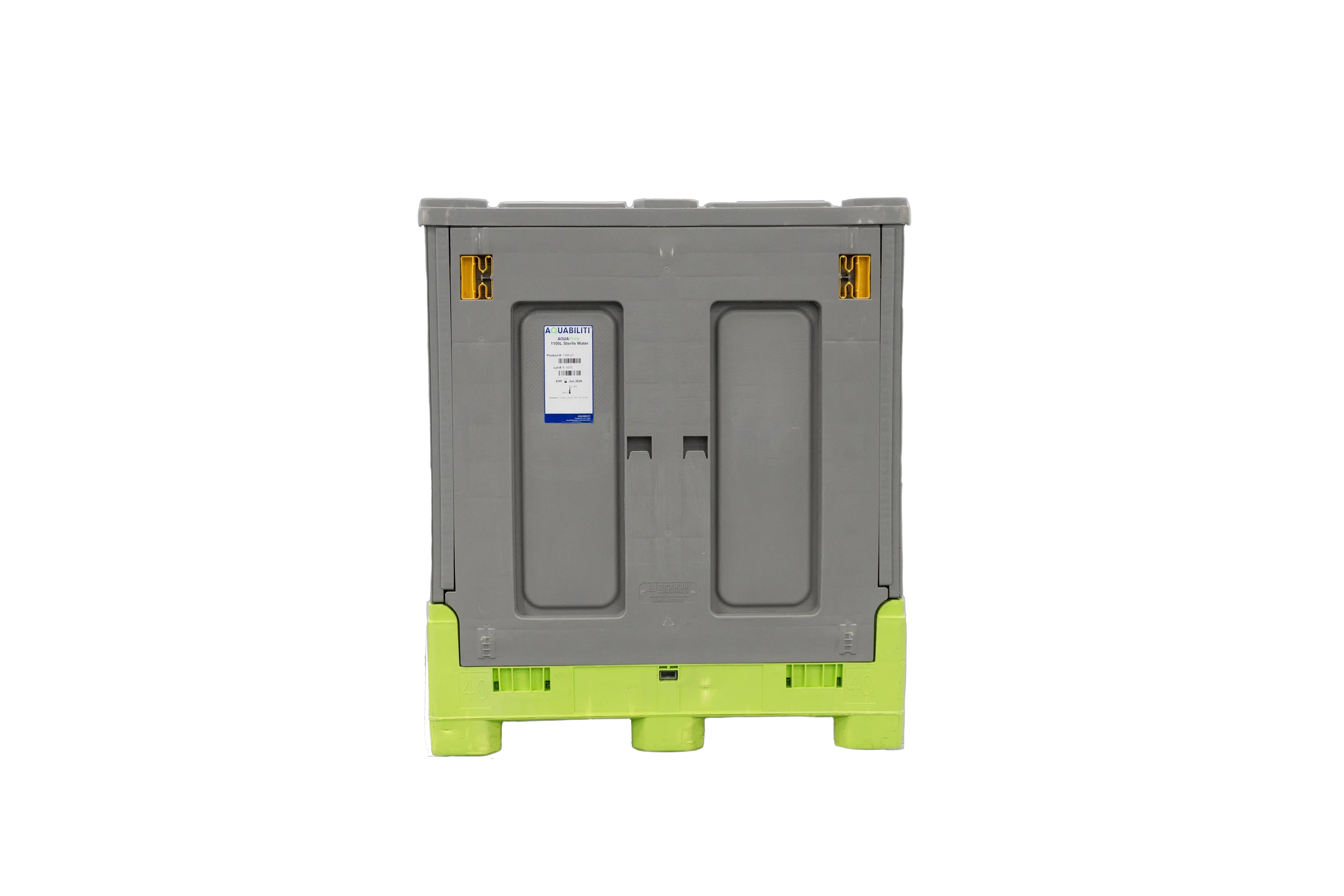 Reusable tote can be collapsed and stacked up to five high, and easily returned to Aquabiliti for reuse