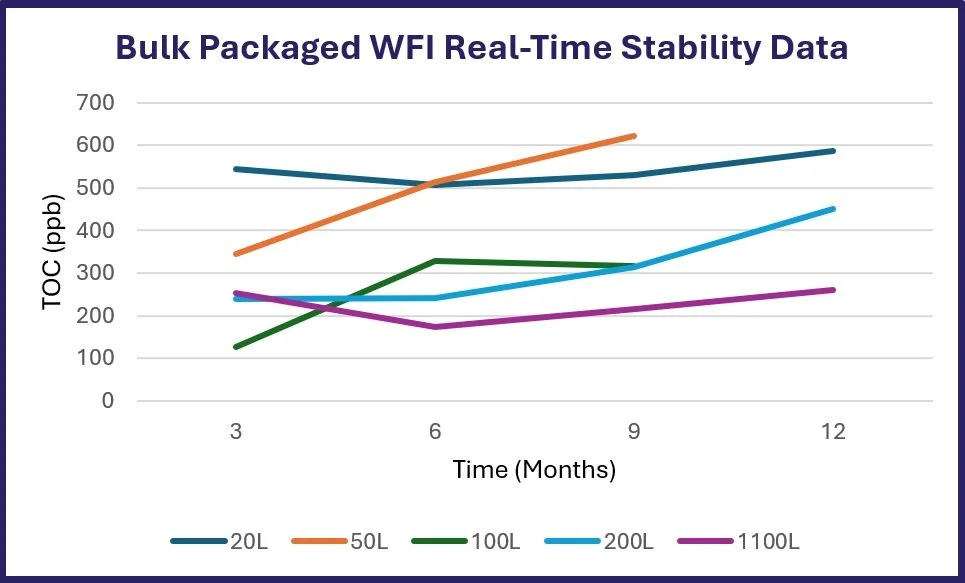 Real-time stability data for Aquabiliti's bulk packaged WFI products reveal an initial increase in TOC post-packaging followed by a gradual increase over shelf life, attributable primarily to packaging interactions. Aquabiliti’s continuous online monitoring of TOC supplied by the WFI generation system has historically been <20 ppb but once packaged can increase by 100 – 1000 ppb depending on container size. Over months of storage at ambient conditions, TOC may rise modestly but remains far below the USP <643> limit of 8,000 ppb.